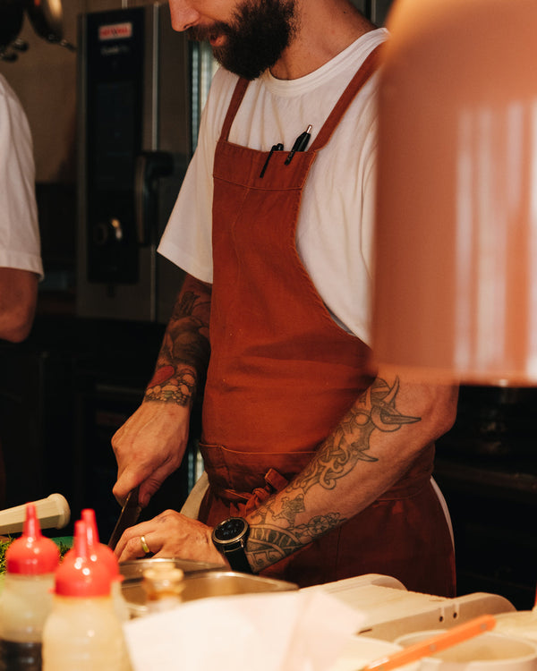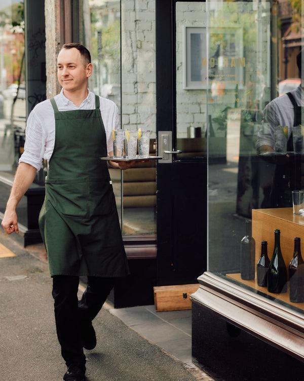 The Mo is Worktones' best-selling and longest-serving apron. It's a bib-style, worn over the shoulders. The straps feed through oxidised eyelets that resist rust and tie neatly at the wearer’s waist. The straps are extra long for comfort and easily adjust for different sizes. The Mo features a front waist pocket and tea towel loop and comes in the largest colour range of all apron styles.